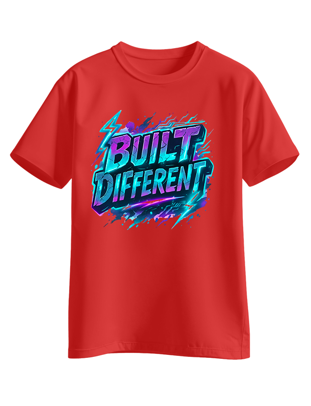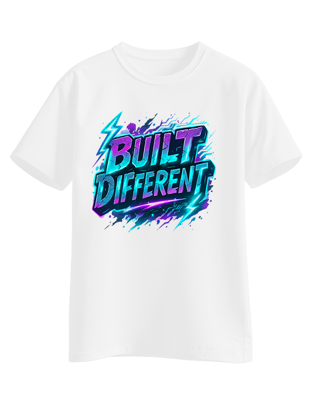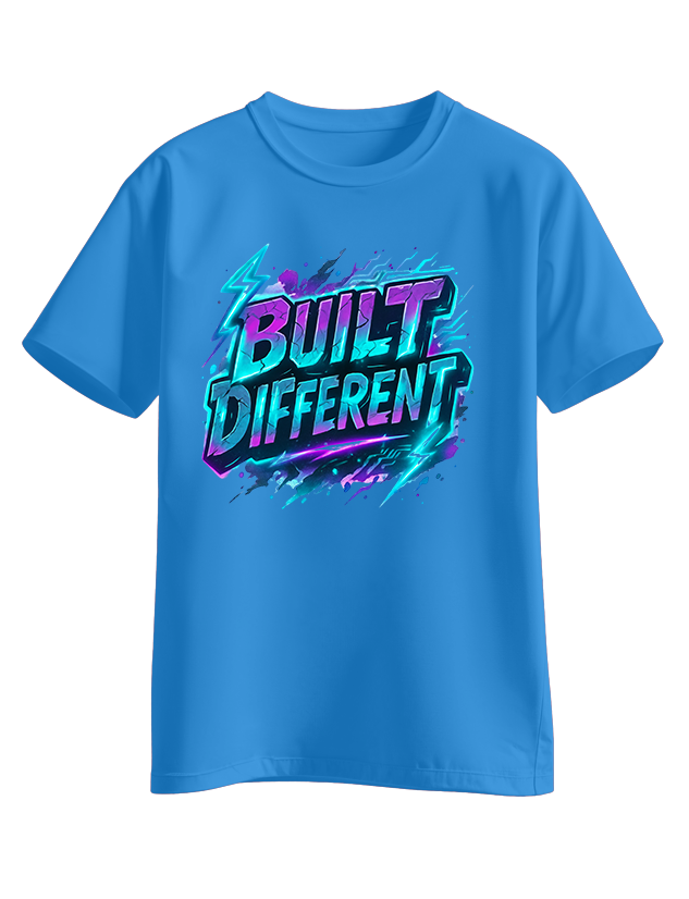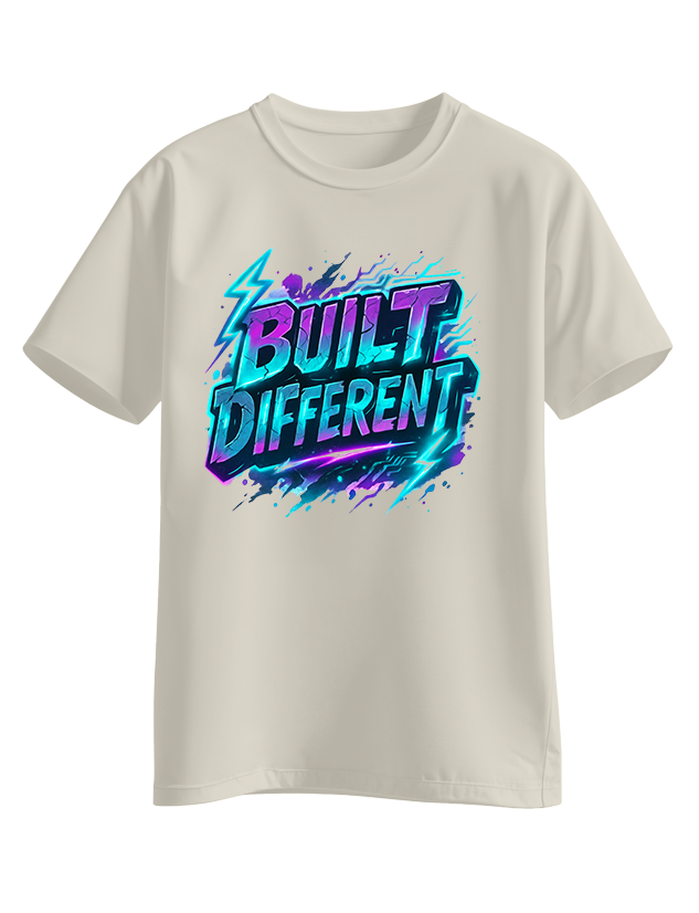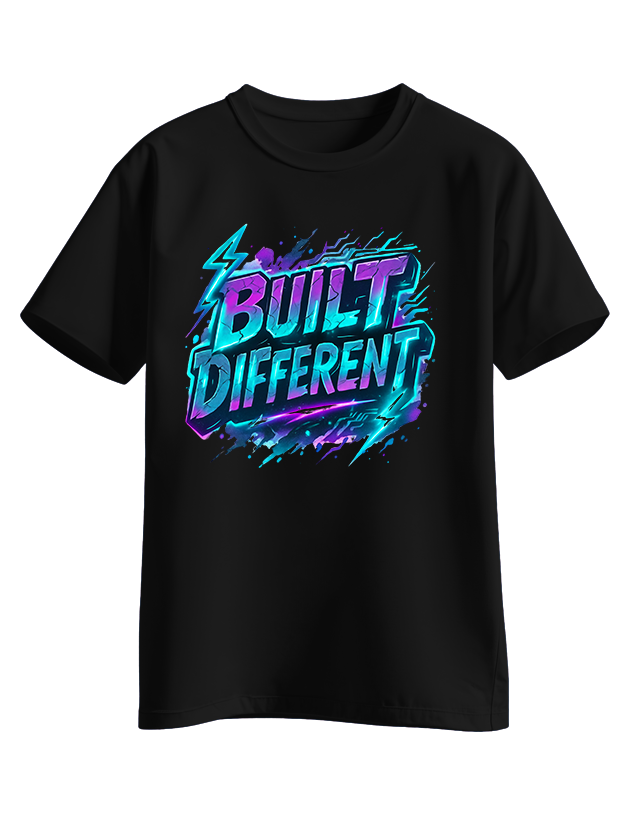 Electric neon-style ‘BUILT DIFFERENT’ graphic in teal, purple, and blue with lightning accents. Statement piece for those who know they are set apart.
