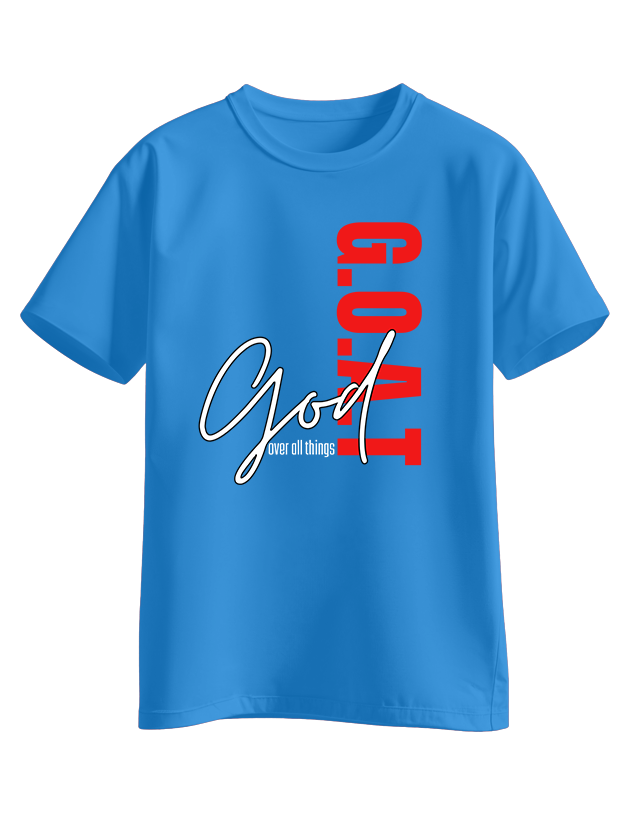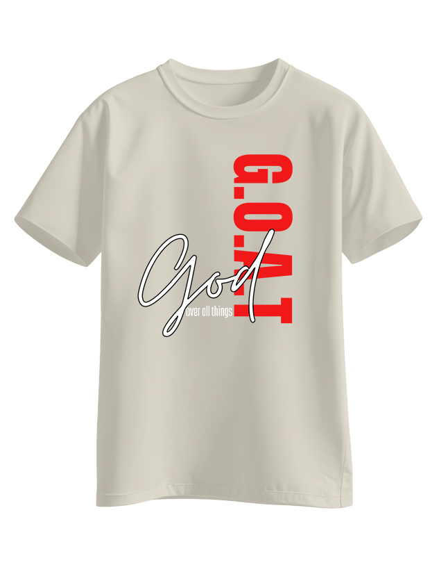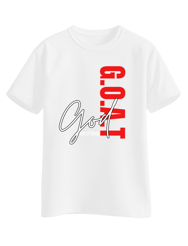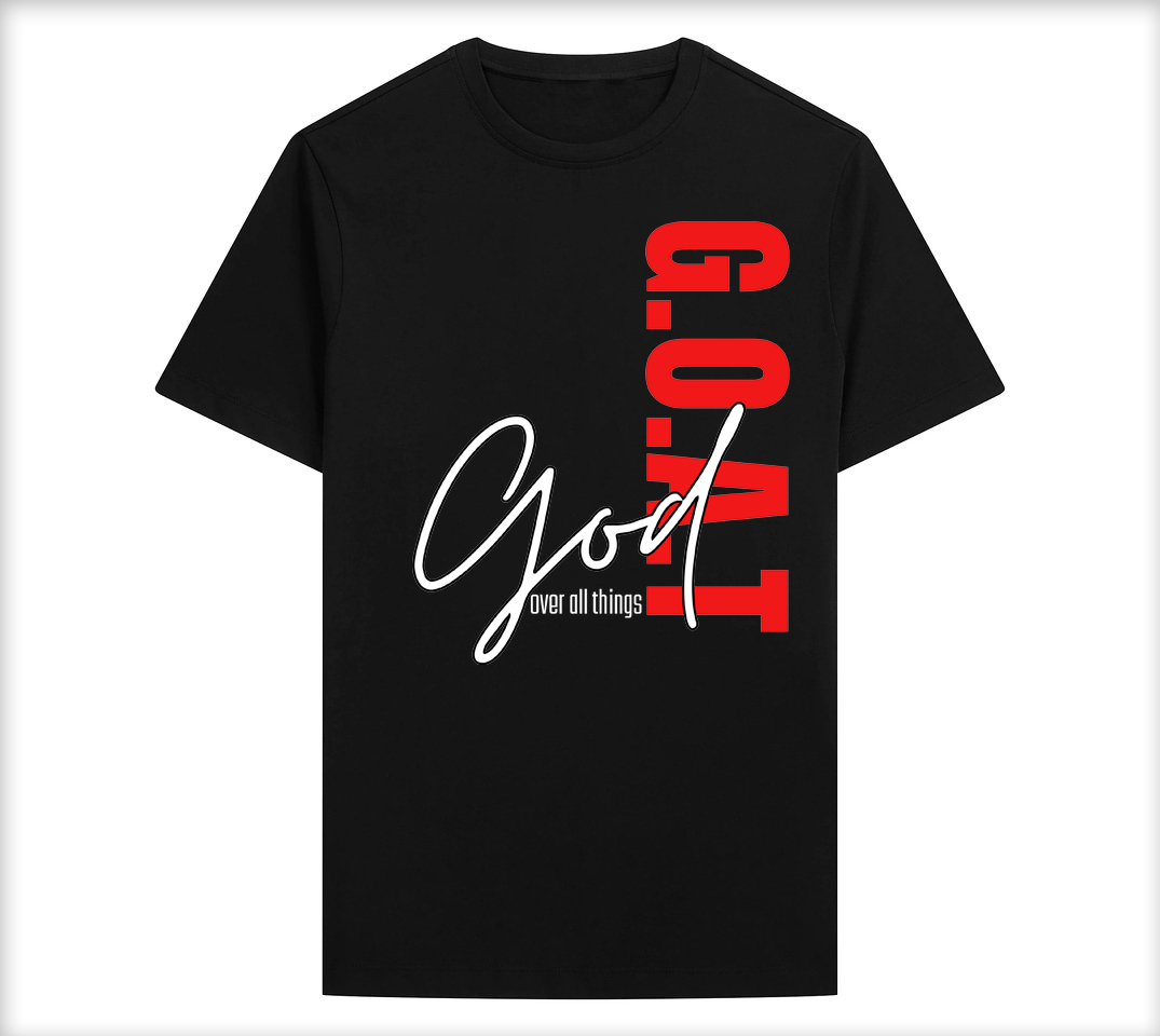 Black tee design with the word “G.O.A.T” stacked vertically in red and “God over all things” written in a flowing white script across the front.