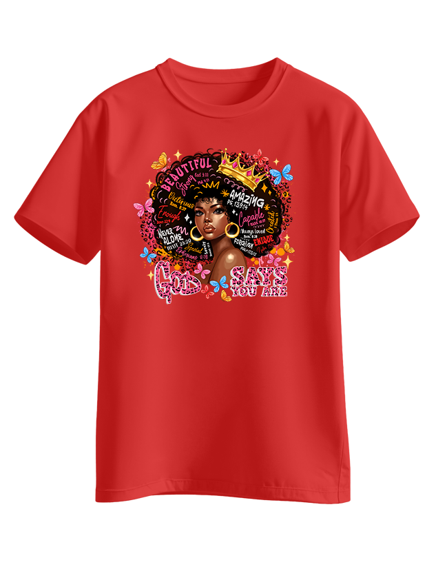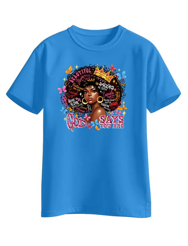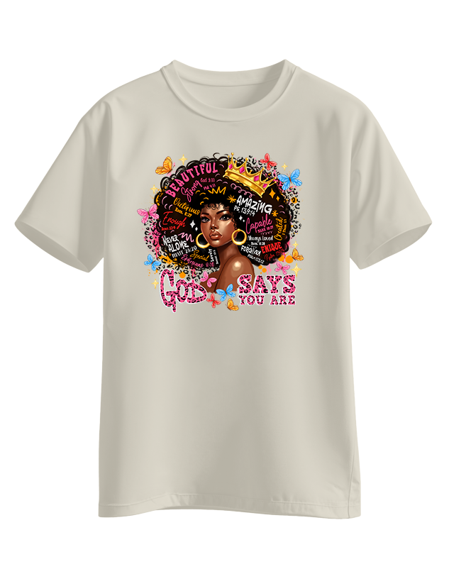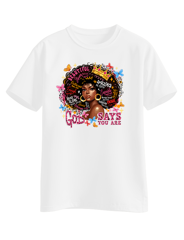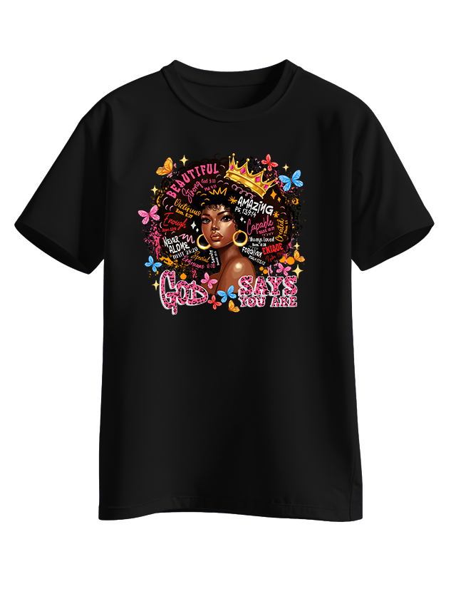 Black tee with an afro queen surrounded by butterflies and affirmations, with the message “GOD SAYS YOU ARE” across the bottom.