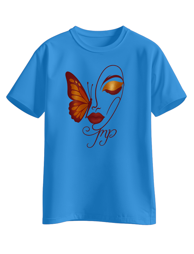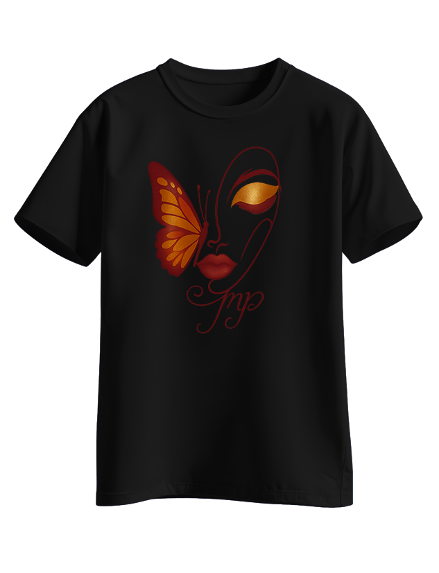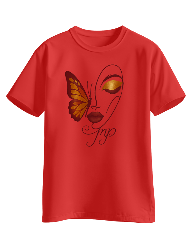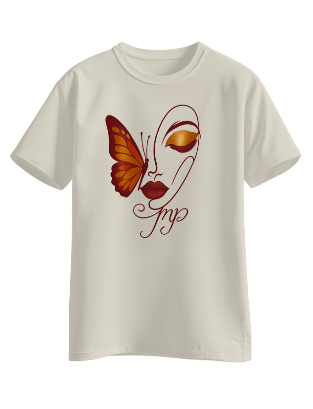 White tee with an elegant line-art face, bold lashes, and a golden-burgundy butterfly on the cheek, finished with a scripted “Pmp” signature.