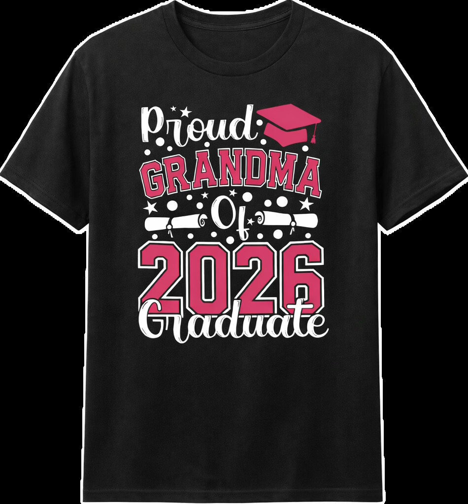 Black T-shirt featuring a bold “Proud Grandma of 2026 Graduate” design in pink and white, accented with a graduation cap and diploma graphics.