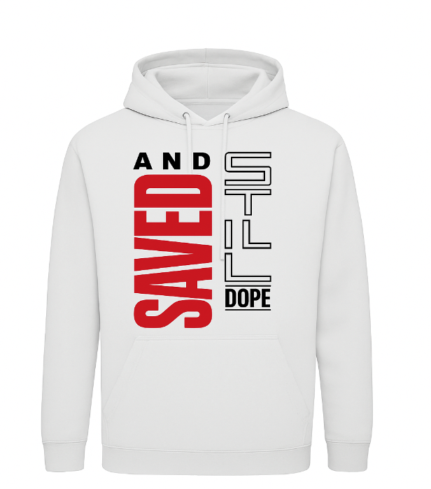 Urban faith design with “SAVED’ in bold red block letters and “AND STILL DOPE in sharp black and white text.