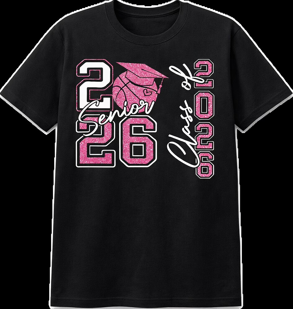 Black T-shirt with a pink glittery look. Class of 2026 design Perfect for proud high school seniors.