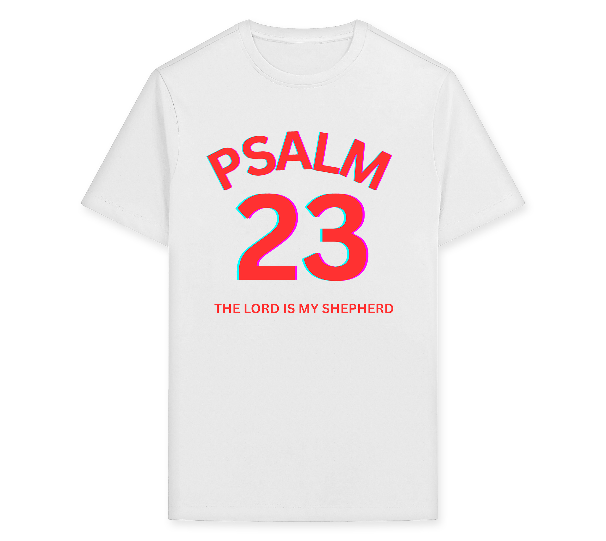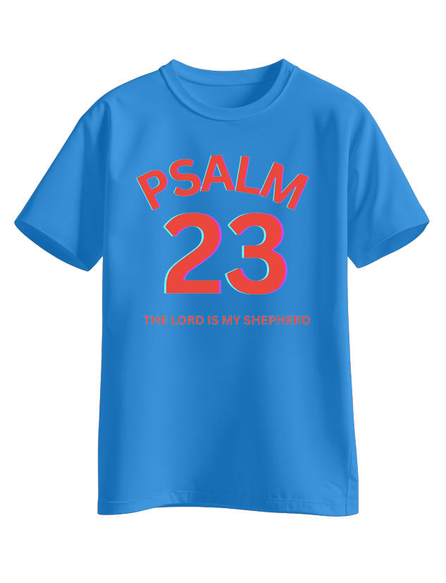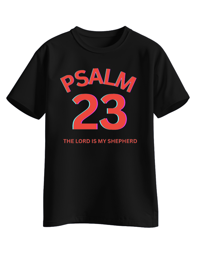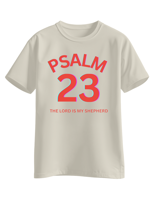 Scripture-inspired layout with “PSALM 23” in large curved numbers and letters and “THE LORD IS MY SHEPHERD” across the bottom.