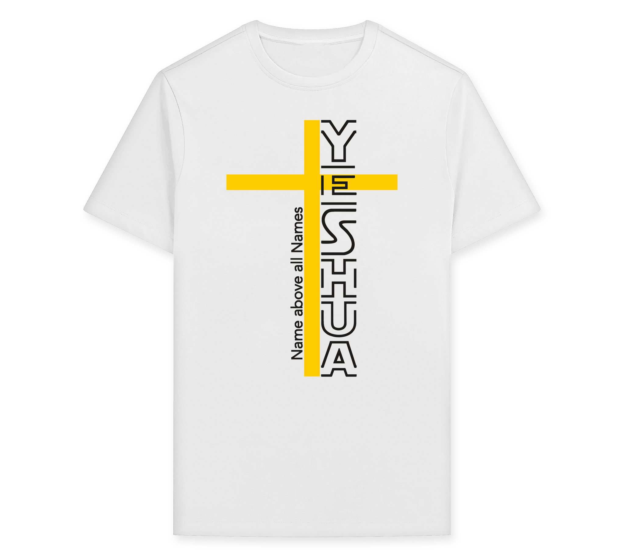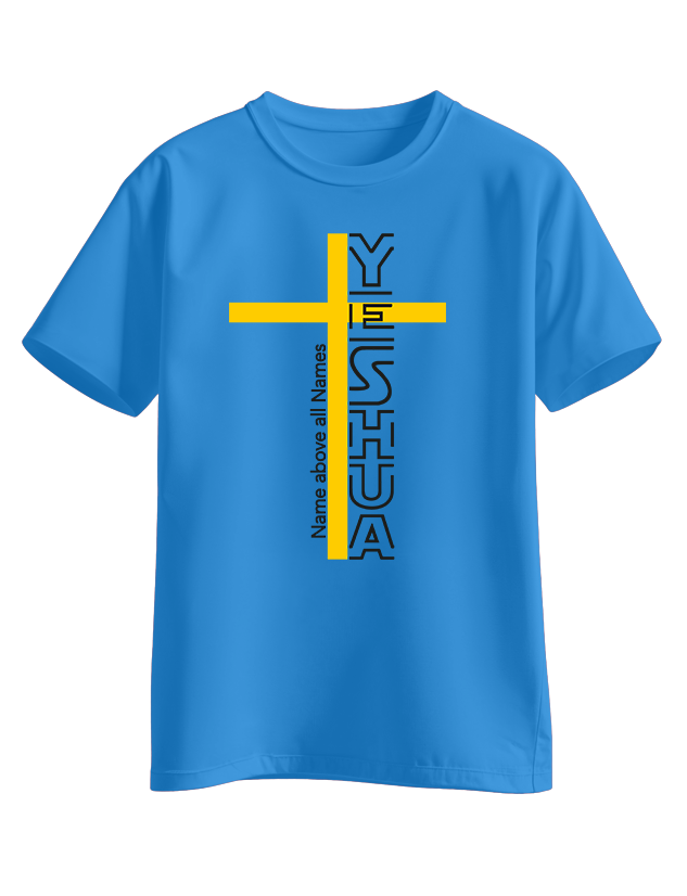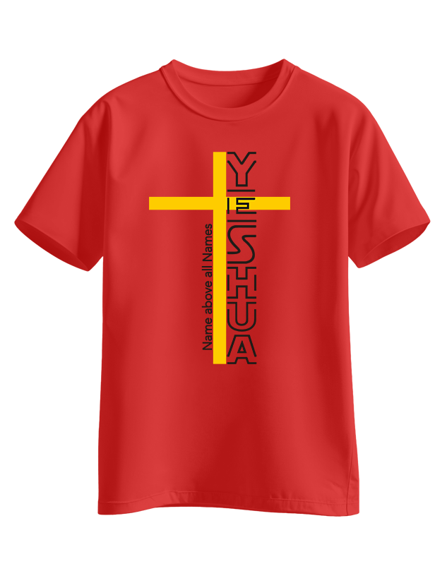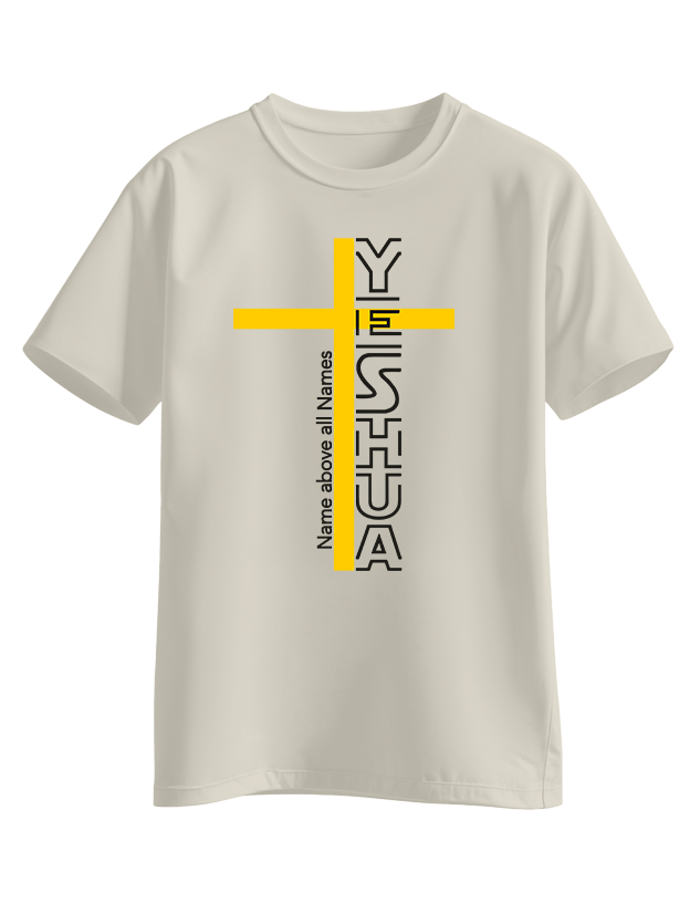 Bold vertical ‘YESHUA’ design intersected by a golden cross with the phrase ‘Name above all Names’ running alongside. Powerful Christian statement tee.