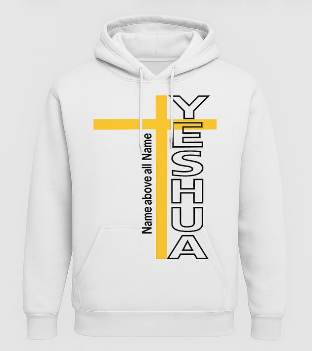 Bold vertical ‘YESHUA” design intersected by a golden cross with the phrase ‘Name above all Names’ running alongside. Powerful Christian statement hoodie